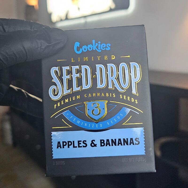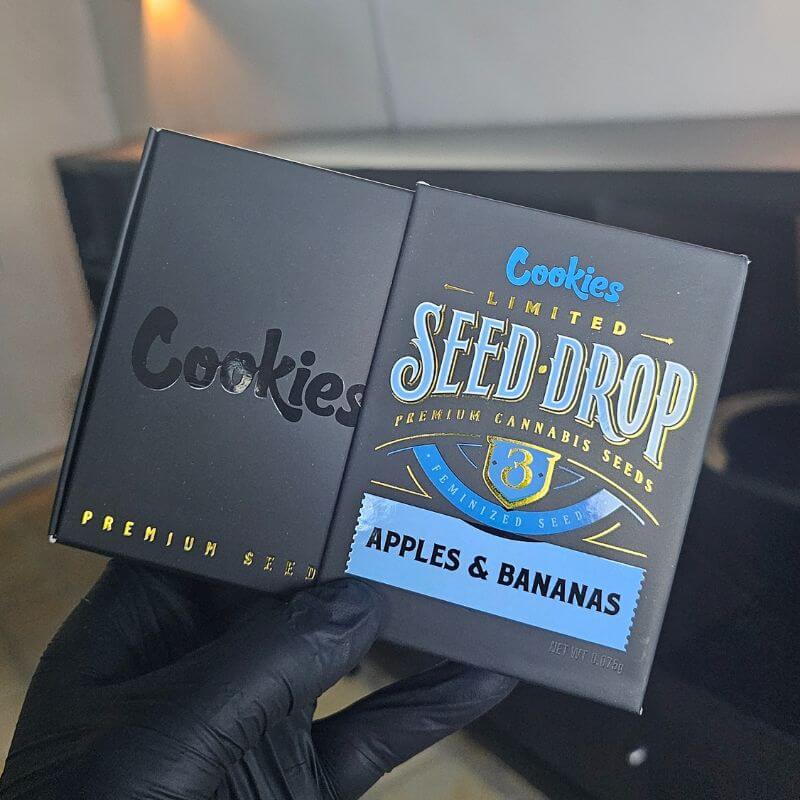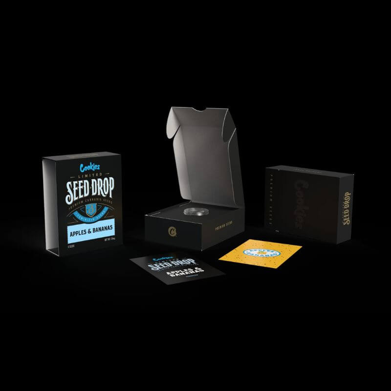 Apples and Bananas by Cookies is a THC-dominant hybrid that unites Platinum Cookies, GDP, Blue Power, and Gelatti genetics. The cultivar blends indica and sativa traits, producing vigorous, robust plants suitable for both indoor and outdoor cultivation. It completes flowering in 8 to 9 weeks and can yield up to approximately 500 g/m² under optimal conditions. The structure is productive and balanced, expressing both relaxation and uplifting euphoria. The breeder highlights its refined aromatic profile and complex flavor, alongside a strong yet manageable growth pattern ideal for growers with basic to moderate experience. Flavor is characterized by baked apple pie and banana pudding.
