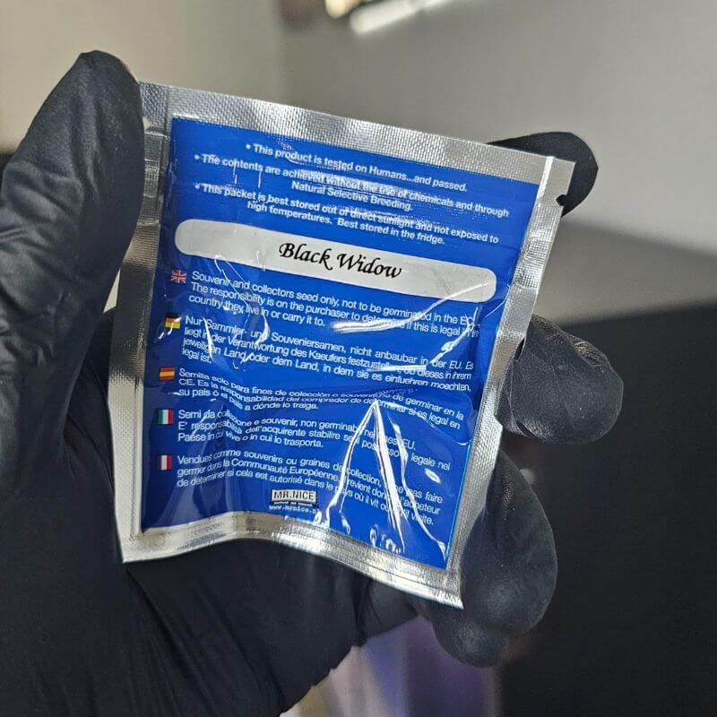 Black Widow by Mr. Nice Seeds is the original award-winning White Widow lineage, bred by Shantibaba after his departure from Green House Seeds. This THC-dominant photoperiod cultivar is the result of crossing a Brazilian Sativa with a South Indian hybrid. Known for its explosive resin production and intense potency, it requires approximately 9–10 weeks of indoor flowering, producing heavy yields of dense, crystal-coated buds. Outdoors in the northern hemisphere, harvest occurs between late September and early October, although extended rain may reduce yields. The aroma combines earthy, spicy, and skunky notes with a sweet pine character reminiscent of early Haze varieties. Black Widow has achieved legendary status since its introduction in 1994, winning the 1995 High Times Cannabis Cup and becoming one of the most influential hybrids in history. This cultivar laid the foundation for countless “White” family strains that followed. Jonny Seeds’ offers the original Mr. Nice version to honor its authenticity, breeding precision, and role in defining the genetic standard of resin-heavy hybrids worldwide.