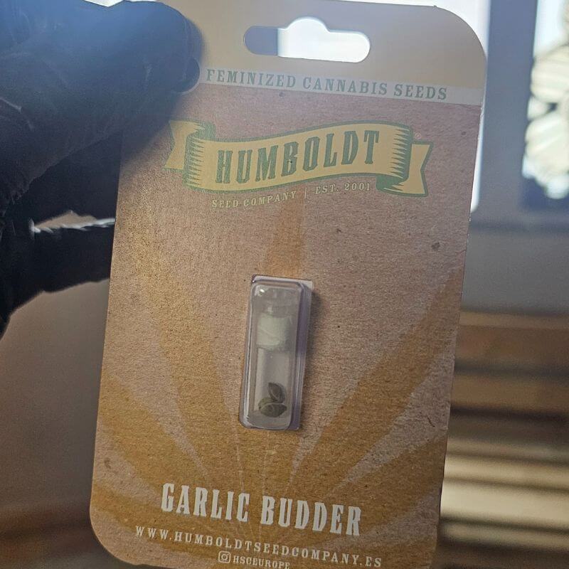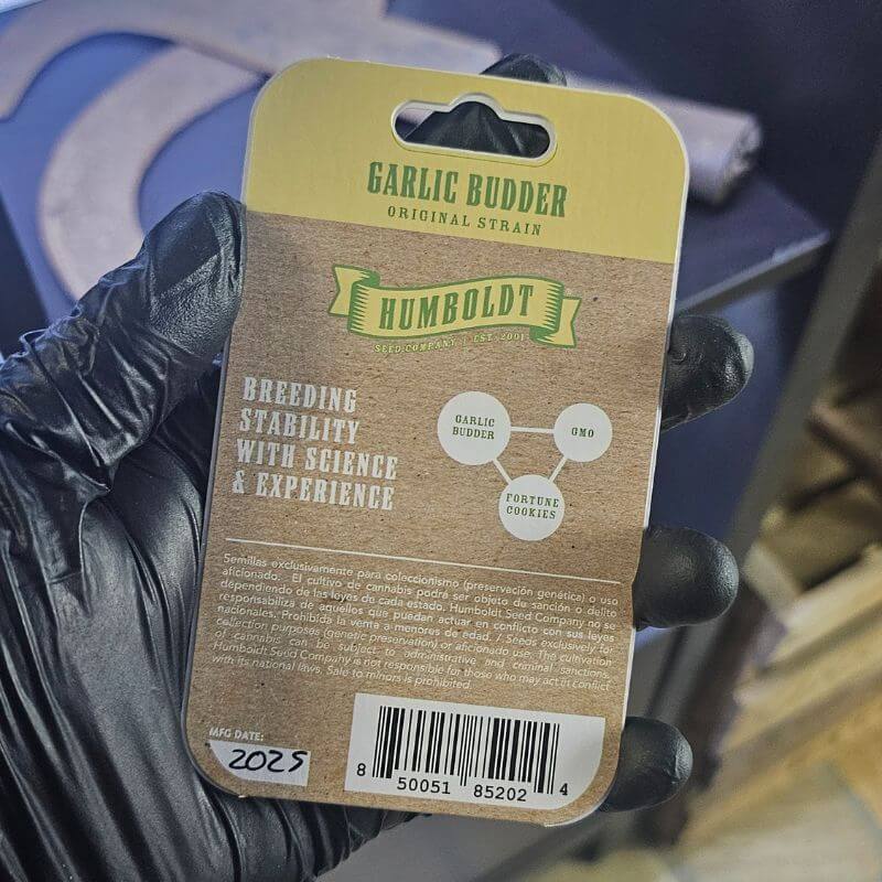 Garlic Budder by Humboldt Seed Company is a feminized, THC-dominant hybrid derived from crossing GMO with Fortune Cookie. This cultivar was selected during the breeder’s 2019 phenotype hunt for its exceptional terpene intensity and structural consistency. With THC levels ranging from 28% to 32%, Garlic Budder produces tall, dense plants covered in a thick layer of trichomes, exhibiting exceptional resin output suitable for extraction. The buds display striking coloration, often developing golden, green, and deep purple tones under cooler late-flowering conditions. Indoors, plants complete their flowering cycle in roughly 70 days, while outdoor harvests occur between October 5th and October 20th, offering consistently high yields in both environments, up to 550 g/m² indoors and exceeding 1,000 g per plant outdoors.The aromatic expression is distinct and complex, dominated by savory garlic, butter, and roasted nut notes accented by a pungent, spicy backend. The terpene composition contributes to a rich, layered profile reminiscent of culinary herbs and creamy undertones. Structurally, Garlic Budder grows vigorously with a balanced internodal spacing and strong apical dominance, making it suitable for SOG or SCROG setups. It thrives in both soil and hydroponic systems, with minimal maintenance requirements and a naturally high disease resistance typical of Humboldt Seed Company lines.The psychoactive profile is extremely potent and long-lasting, delivering a full-body relaxation that borders on sedative while maintaining a euphoric, mood-lifting onset. This intensity, paired with its distinctive savory flavor, makes Garlic Budder a standout choice for seasoned users and connoisseurs seeking maximum resin density and terpene depth. Its ease of cultivation and structural resilience also make it accessible to beginners who want a high-performance cultivar without technical complexity.From a historical and breeding perspective, Garlic Budder extends the legacy of GMO, renowned for its “garlic cookies” profile, by introducing greater stability, yield consistency, and refined flavor smoothness through the Fortune Cookie lineage. It reflects Humboldt Seed Company’s continuous innovation in modern high-THC hybrids while preserving the essence of classic West Coast fuel and spice cultivars that shaped California’s cannabis identity.
