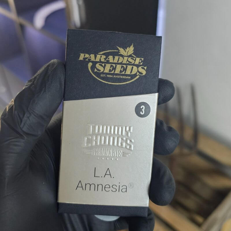 L.A. Amnesia is a feminized, photoperiod-dependent hybrid from Paradise Seeds created by crossing Afghan Kush with Amnesia. The combination blends the energetic, euphoric influence of Amnesia with the resin production, density, and yield reinforcement typical of Afghan Kush.This cultivar flowers in 8–9 weeks indoors and reaches harvest in mid-October outdoors, producing up to 600 g/m² inside and up to 1000 g per plant under warm, sunny outdoor conditions. Plants develop strong central colas, dense trichome-rich buds, and maintain manageable height due to the Kush influence, reducing excessive sativa stretch.The terpene profile is rich in limonene and myrcene, generating citrus and mango aromas during growth, which remain present after drying alongside subtle spicy Olibanum notes and a smooth citrus haze flavor.The psychoactive effect is described as an electrifying, potent cerebral high ideal for creative or social use, followed by a gradual transition into a smooth relaxation; the breeder recommends it for experienced users due to its intensity. Medical users report potential benefits for focus, mental clarity, mood, and stress relief.Outdoors, the cultivar thrives in Mediterranean climates and performs in temperate regions, though dense buds may require attention in high humidity. As part of the Tommy Chong Collection, L.A. Amnesia represents Paradise Seeds’ approach to combining elite, high-resin genetics with terpene-forward aroma.